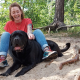 Harrie hield van wandelen met grote, dikke takken in zijn bek, palen, tot aan boomstammen toe. Ik heb het over serieus zwaar geschut. Dat als ie er één liet vallen en ik wilde oppakken, het me niet lukte. En altijd moest ie dan vlak achter me lopen, al links- en rechts kijkend. M’n benen zijn er niet mooier op geworden. Heb ook wat af gevloekt als ie zo’n zwaar ding op m’n hak liet vallen. Maar de mensen vonden het allemaal prachtig. Alles moest mee naar huis waar ie trots was op zijn verzameling.